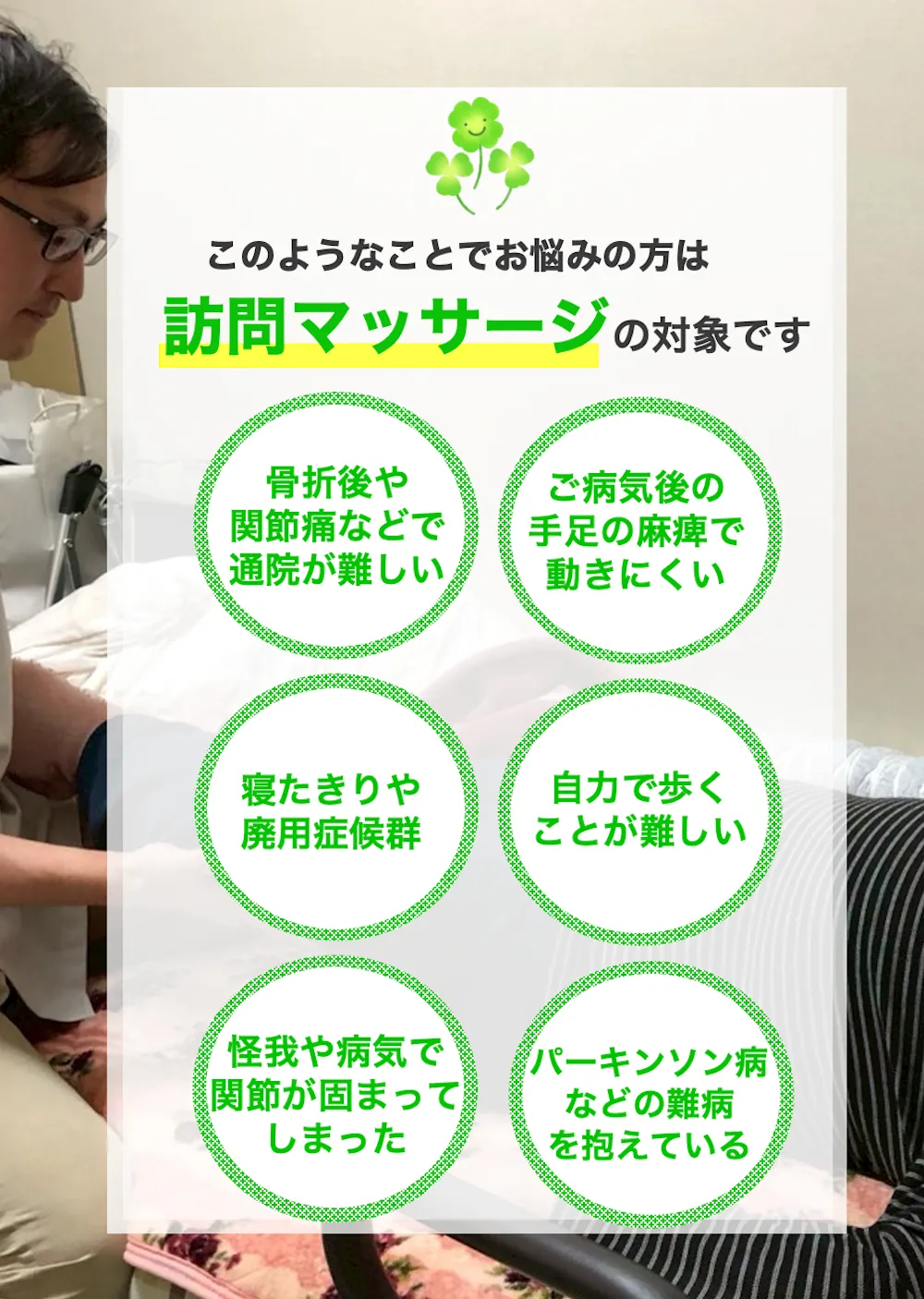 上記のような外出や通院がむずかしい方のために、マッサージ師・鍼灸師の資格を持つスタッフがご訪問し心身が少しでも楽になるようお手伝いをさせていただいております。