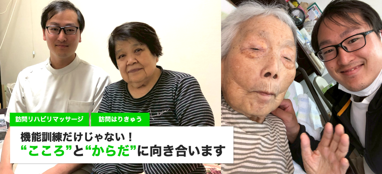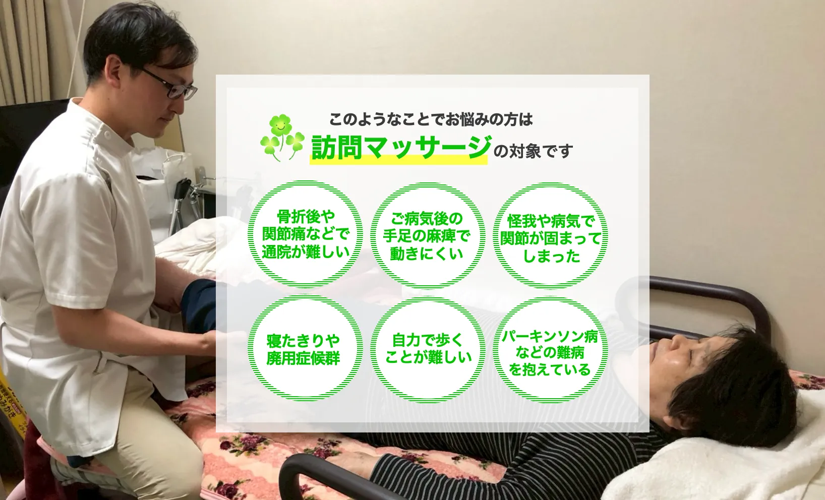 ご自宅や施設などにお伺いし、その場でマッサージや鍼灸・機能訓練を受けていただけます。